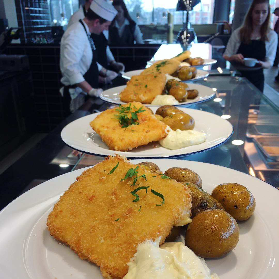 Milovníky ryb potěšíme pošírovanou bílou treskou (připravenou v páře), jejíž jemnou chuť doplňuje pivní majonéza a mačkaný cukrový hrášek.