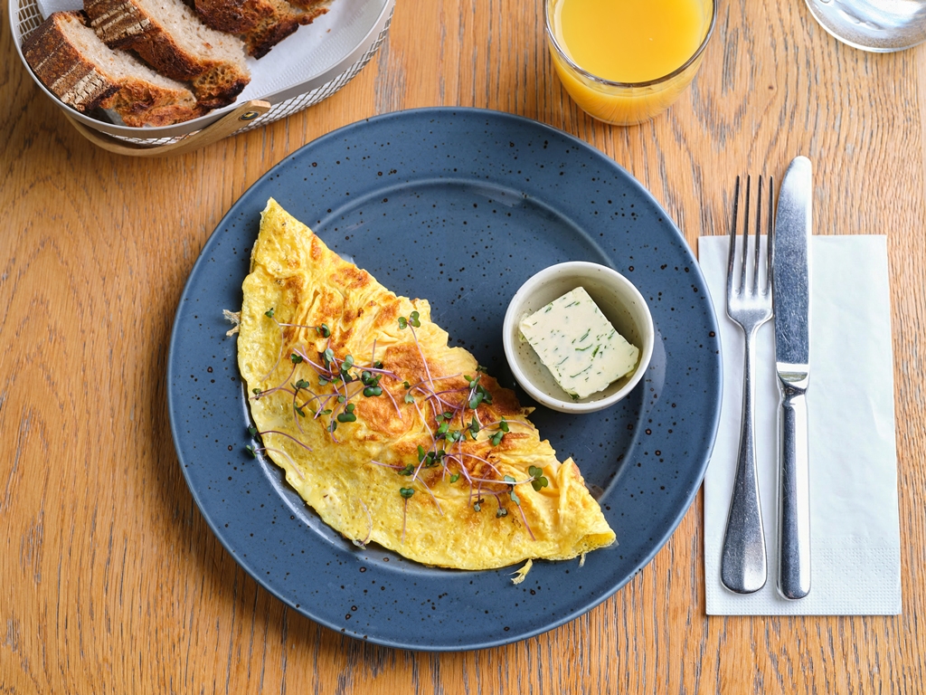 Omeleta se šunkou a sýrem, bylinkové máslo, náš chléb 185 Kč /FOTO /
