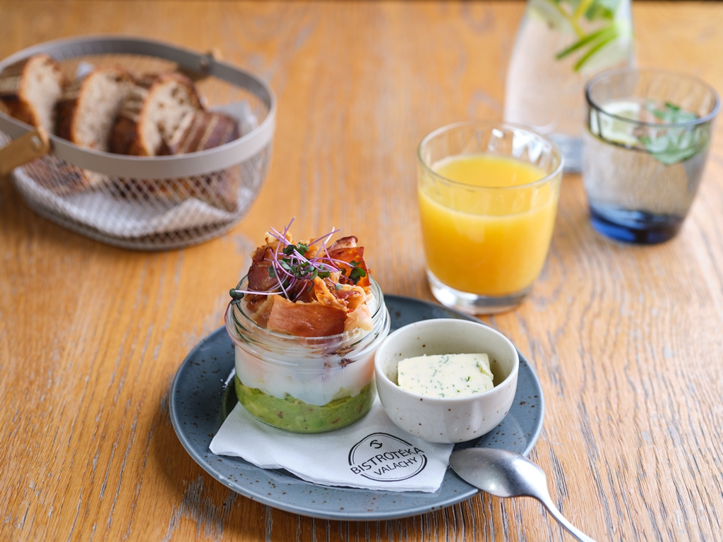 Tři vejce do skla s máslem, guacamole, slanina, bylinkové máslo, náš chléb 225 Kč /FOTO /