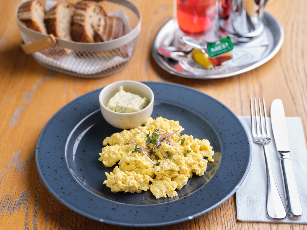 Lanýžová míchaná vejce na přepuštěném másle s parmezánem, bylinkové máslo, náš chléb 259 Kč /FOTO /