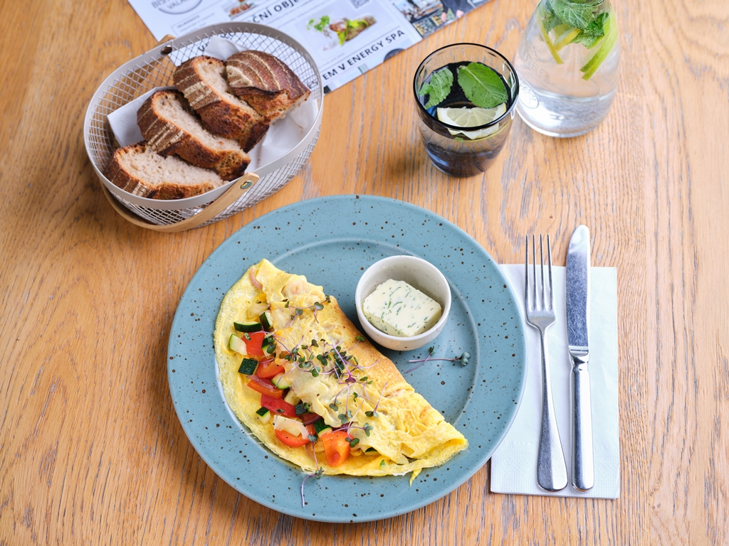 Omeleta s restovanou cuketou, paprikou a cibulkou, bylinkové máslo, náš chléb 185 Kč /FOTO /