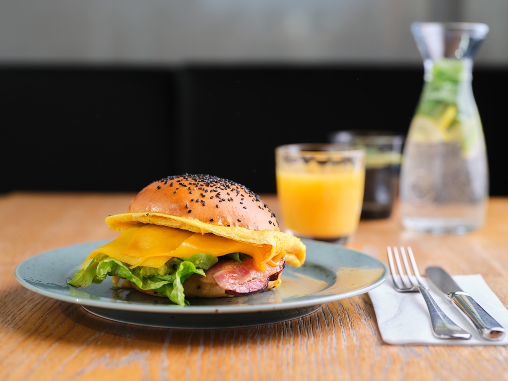 Snídaňový burger, vaječná omeleta, guacamole, slanina, cheddar, rajče, salát 225 Kč /FOTO /