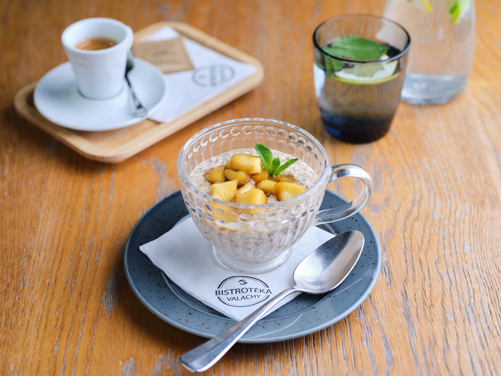 Proteinové overnight oats s restovanými jablíčky /ovesné vločky, chia semínka, vanilkový protein, mandlové máslo, mléko a ovoce/ 155 Kč /FOTO /