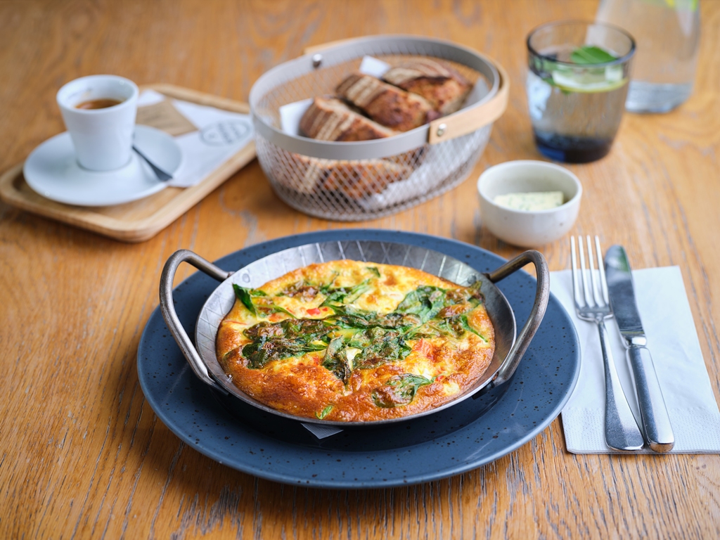Frittata se sýrem feta, červenou paprikou a baby špenátem, bylinkové máslo, náš chléb 215 Kč /FOTO /