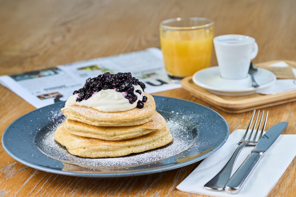 Lívance s borůvkovým přelivem, citronový smetánek 175 Kč /FOTO /