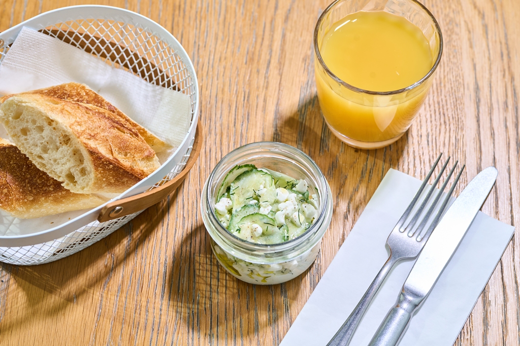 Cottage, okurka, kopr, olivový olej, naše bageta 135 Kč /FOTO /