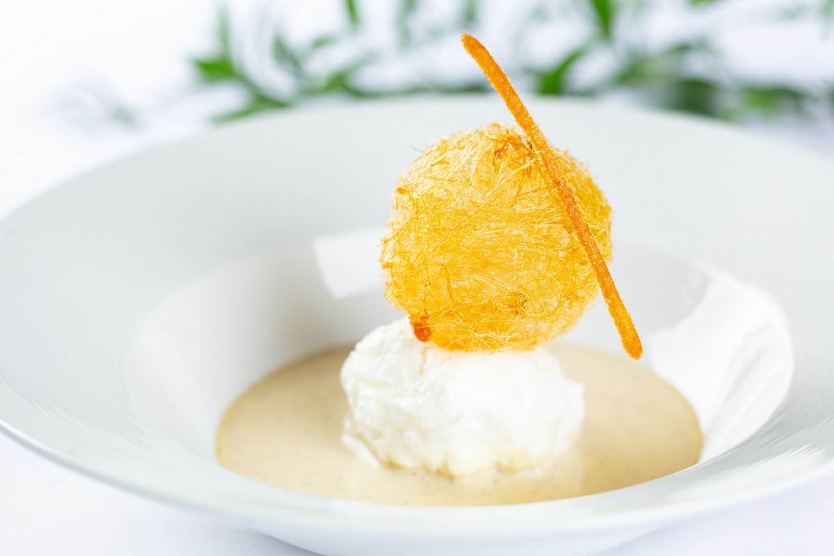 Îles flottantes, neboli noky z bílkového sněhu v šodó, je dezert, který se skládá z vanilkové omáčky, ostrovu z našlehaných bílků a karamelové koule.