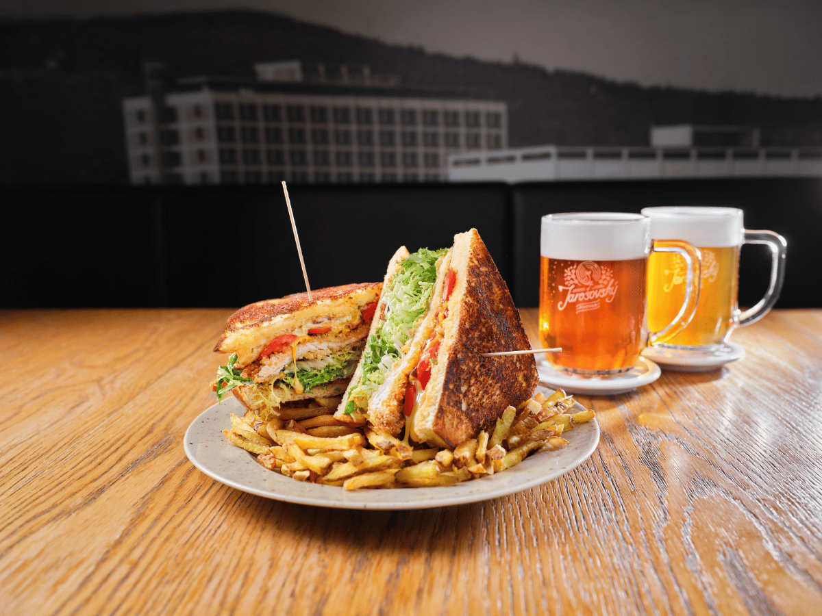křupavý sendvič z máslové briošky se smaženým kuřetem nebo sýrem, naše hranolky smažené v hovězím loji a k tomu dvě Jarošovská piva nebo dvě Kofoly – to vše za výjimečných 399 Kč.