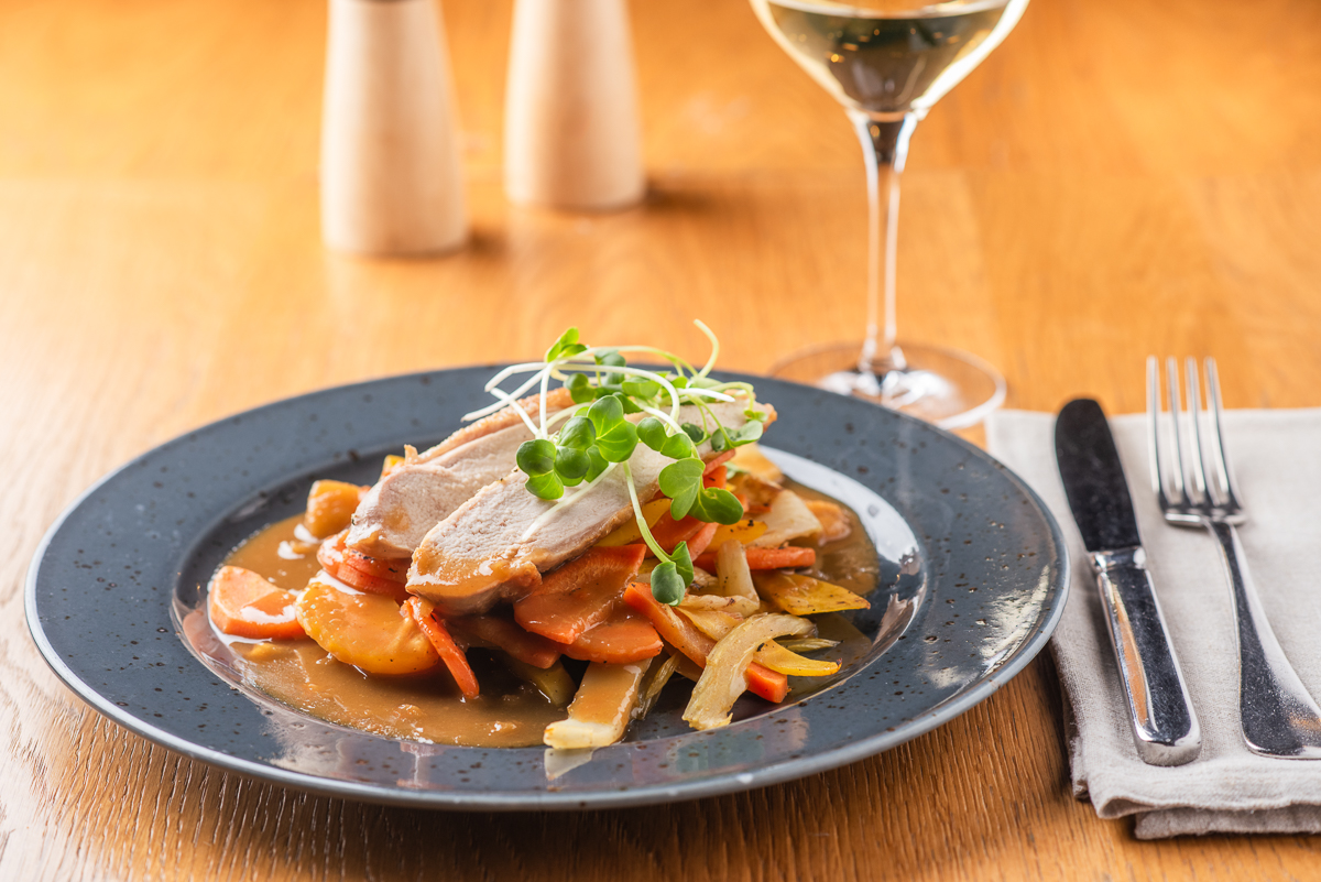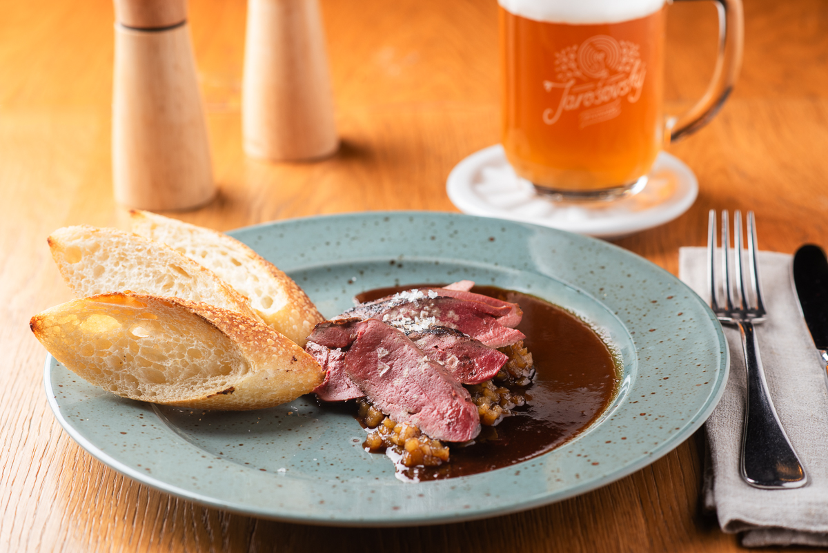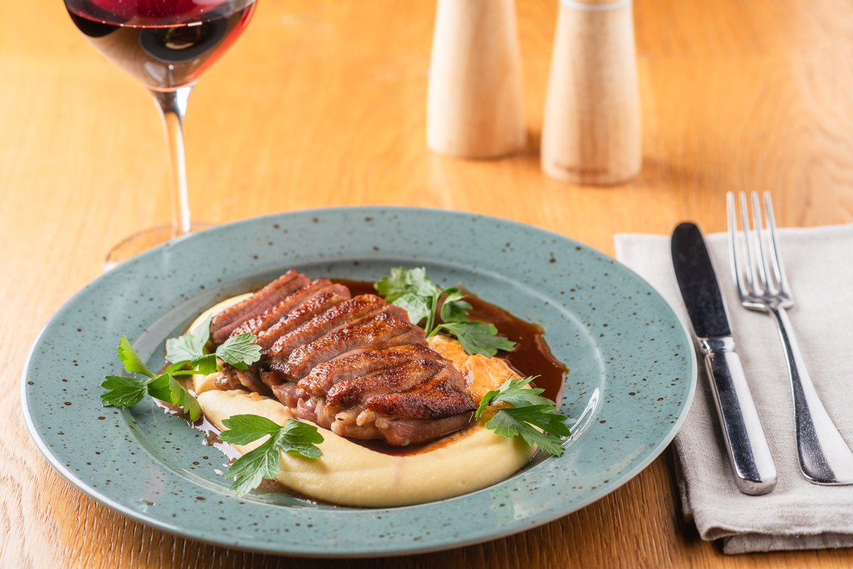 Kachní prso sous-vide, bramborovo-celerové pyré, rozmarýnový demi-glace 365 Kč /FOTO /