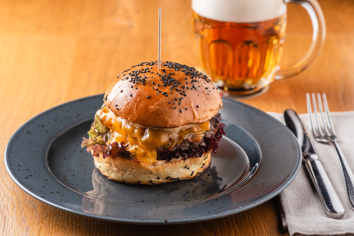 Hamburger s grilovaným oštiepokem, brusinková majonéza, salát, rajče 255 Kč /FOTO /