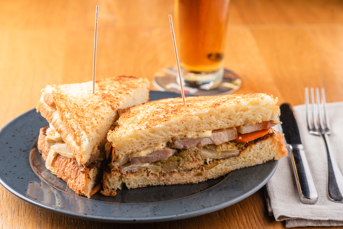 Toust s bůčkem pěti vůní, majonéza z hrubozrnné hořčice, naše kimchi* s koriandrem 275 Kč /FOTO /