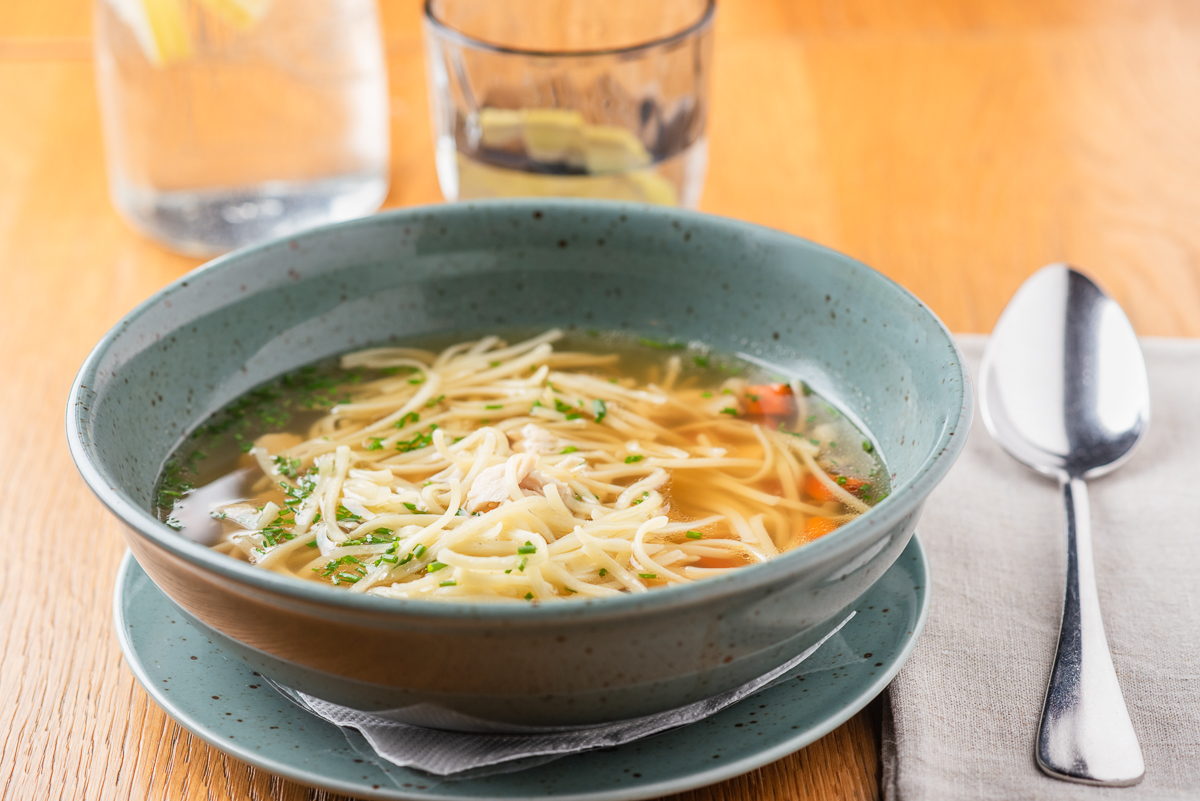 FIT: Kuřecí vývar s nudlemi, zeleninou a kuřecím masem 125 Kč /FOTO /