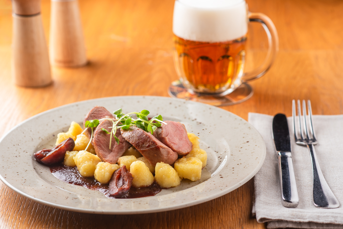 Zauzená vepřová panenka, švestková omáčka, nakládaná švestka ve slivovici, bramborové noky restované na másle 325 Kč /FOTO /