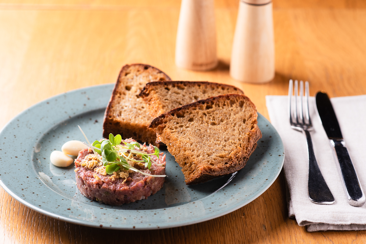 Zvěřinový tatarák s foie gras*, šalotka, kapary, jalovcový olej, žloutek, dijonská hořčice a topinky z našeho kváskového chleba 395 Kč /FOTO /