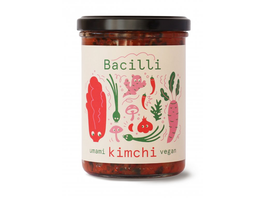 Tohle kimchi obsahuje fermentované mořské řasy Wakame a houby shiitake a navíc lahůdkové droždí, což zajišťuje hlubokou umami chuť typickou pro autentické kimchi bez nutnosti použití rybí omáčky a drcených krevet. Barvy a ostrosti je dosaženo originální korejskou pálivou paprikou.